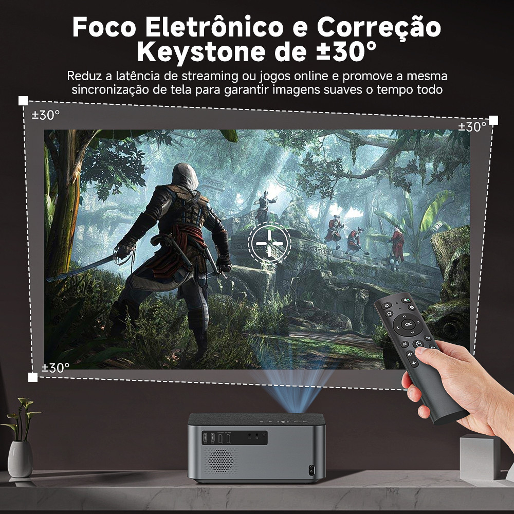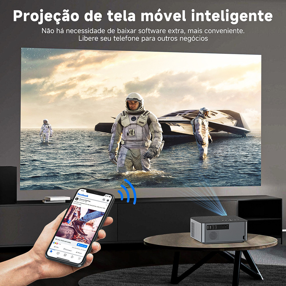 Além disso, o projetor possui Bluetooth 5.0, permitindo pareamento rápido com soundbars, fones de ouvido, caixinhas de som e outros dispositivos com total estabilidade. Isso faz toda a diferença quando você busca uma experiência sonora imersiva para filmes, música ou jogos.