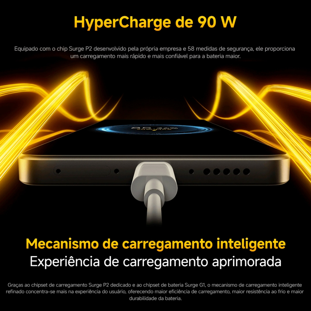 E quando precisar recarregar, o HyperCharge de 90W garante 100% em apenas 42 minutos. Isso significa mais liberdade, menos tempo na tomada e uma rotina muito mais prática.